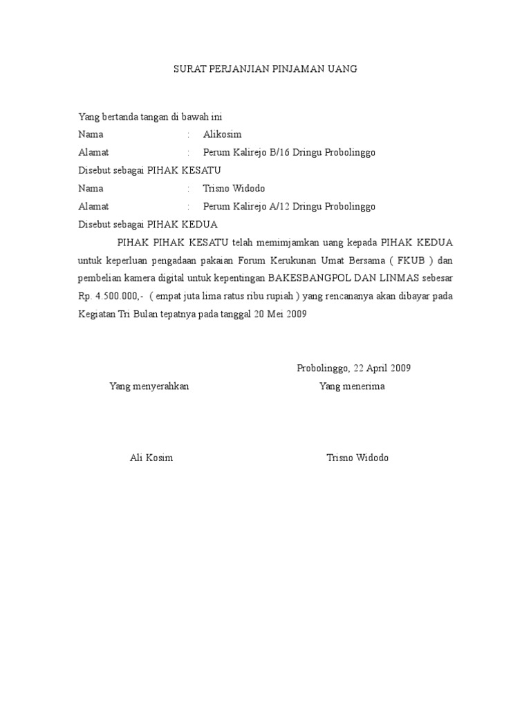 Contoh Perjanjian Pinjam Duit. Unduh sebagai DOC PDF TXT atau baca online dari Scribd. Seperti yang sudah disinggung bahwa surat perjanjian peminjaman uang ini sangat penting dalam urusan utang piutang.